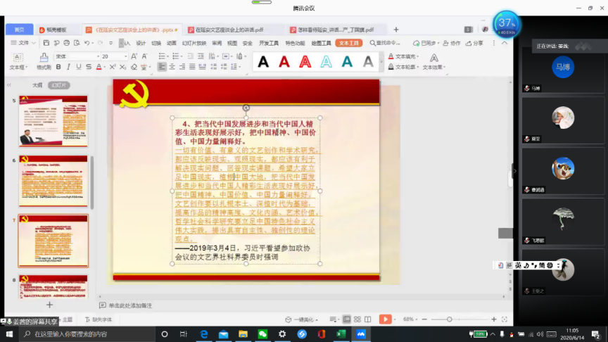 在具体的文本解读中,系统梳理了文艺创造关于为什么人的问题。《讲话》强调我们的文学艺术都是为人民大众的;其次是关于如何去服务?马克思主义文论强调一切种类的文学艺术作品,都是一定的社会生活在人类头脑中的反映。因此文学家艺术家,必须到群众中去;关于文艺批评问题,《讲话》认为文艺批评有两个标准,一个是政治标准,一个是艺术标准,应当以政治标准放在第一位,以艺术标准放在第二位的。我们当下的要求则是政治和艺术的统一,内容和形式的统一,革命的政治内容和尽可能完美的艺术形式的统一。第四个问题是对文艺工作者的希望:坚持以人民为中心的创作导向,从而创造出符合人民群众需求的文艺作品,创造出无愧于时代的优秀作品。