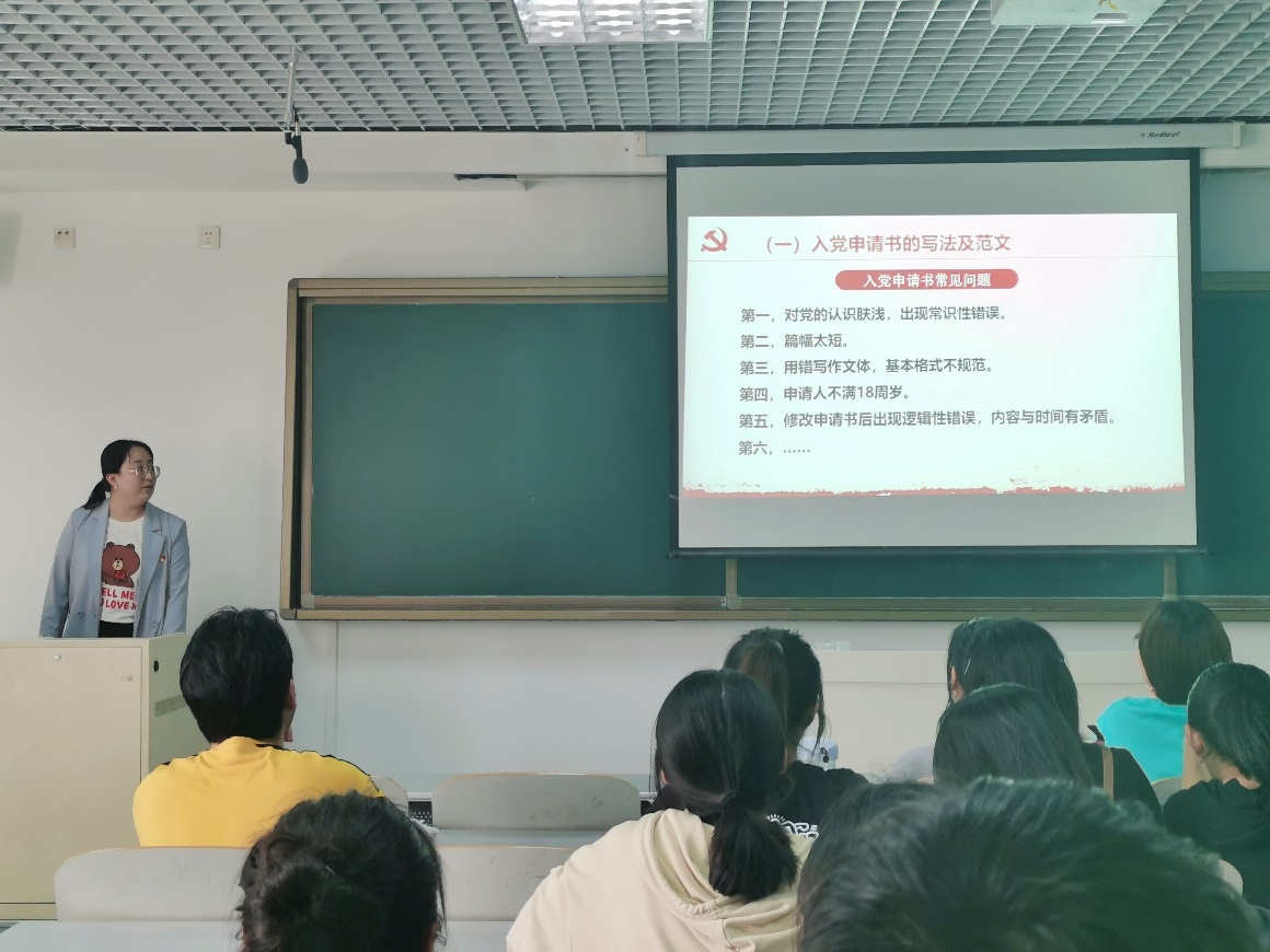 郑娇阳老师就培训日程安排进行讲解,强调了相关的培训纪律和要求,提醒同学们要明确自己的入党动机,树立为人民群众服务的意识,从实事做起,不忘初心,砥砺前行。党务秘书助理史华威结合实践经验就入党材料填写规范进行讲解,按照发展党员的流程详细说明入党申请书、思想汇报和个人自传等三部分内容的填写要求,旨在培养同学们严谨细致的学习态度。