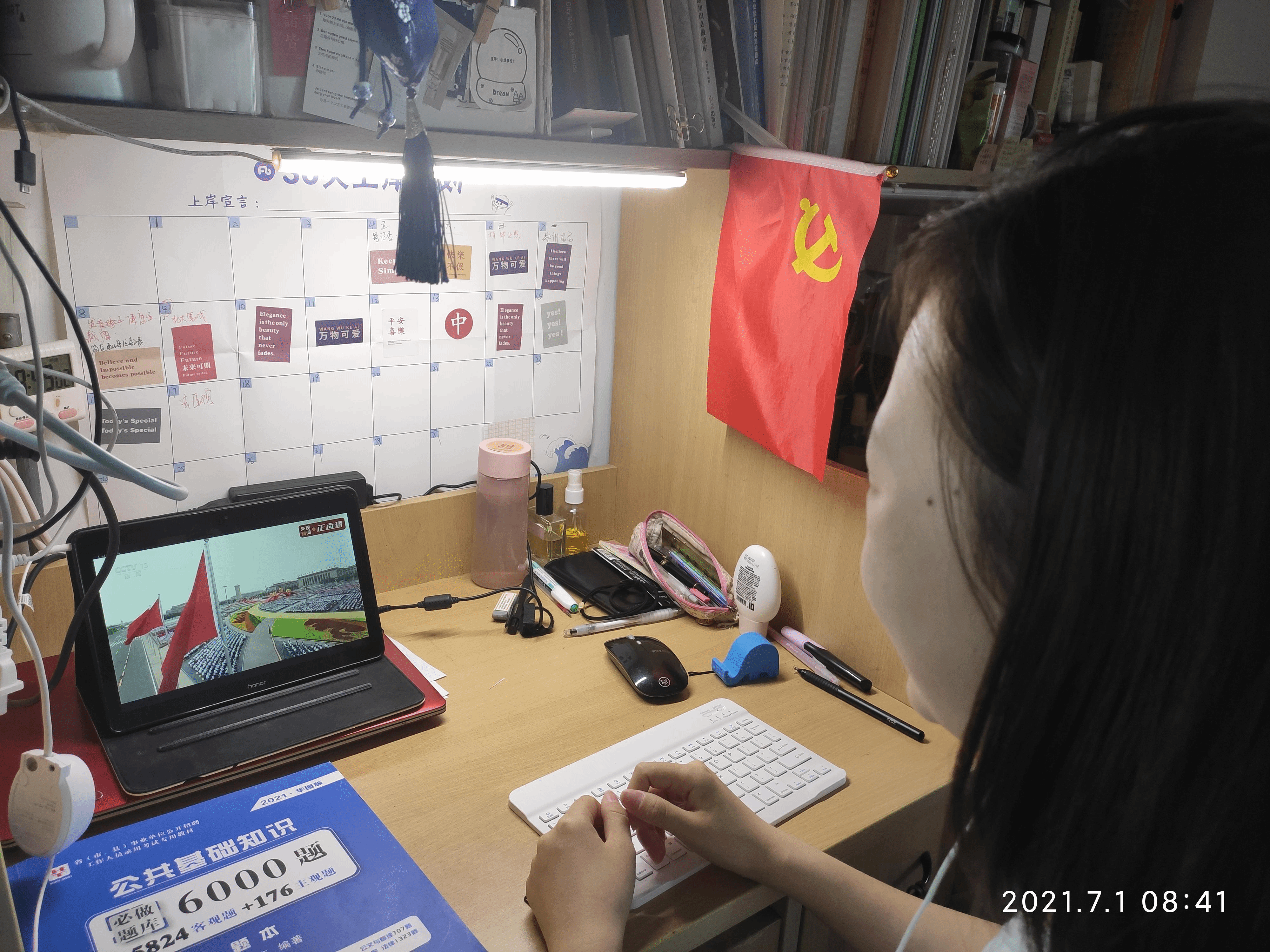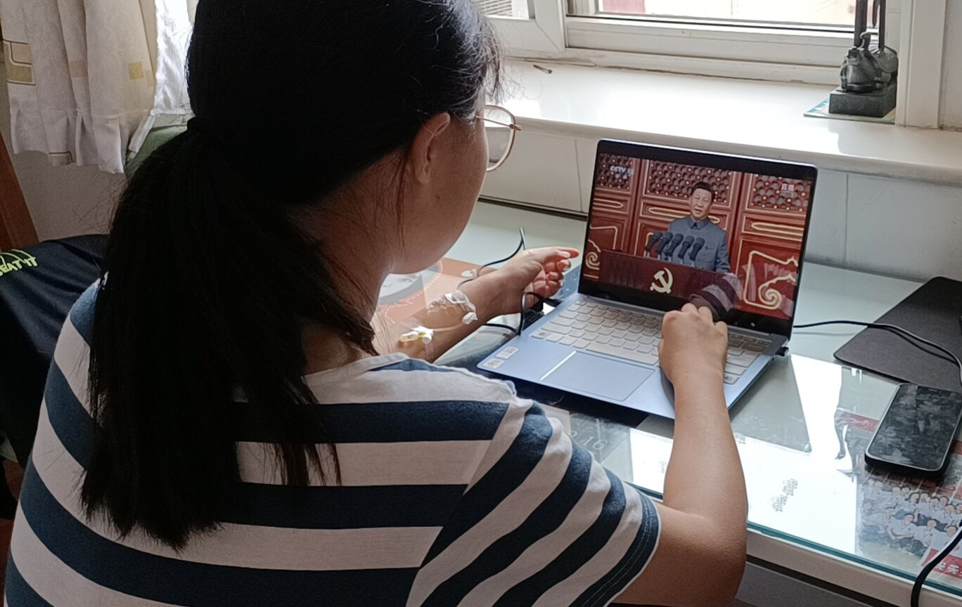 万丽华:怀着极其喜悦、兴奋的心情,和文公司党组织的全体党员在会议室一同收看了庆祝中国共产党成立100周年大会的直播盛况。现场庄严的仪式、喜庆的气氛、威严的国旗仪仗队,映入眼帘的盈盈笑脸,无不昭示着人们发自内心的欢乐和幸福!这种宏大、热烈的氛围感染着每一位收看大会的党员们!