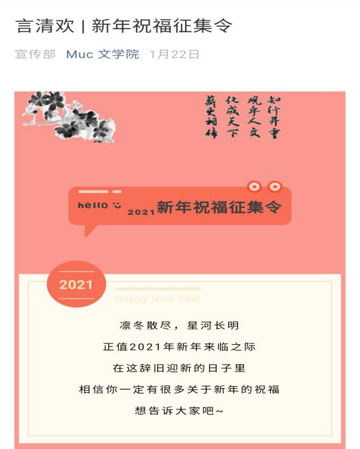 活动招募截止后,2月1日至2月7日,利来国际团委宣传部整理报名信息与作品,由部长、主席团、老师根据活动要求进行评审。投稿作品图文相配,制作精美,同学们在表达新年期许的同时,也为2021年的自己定下目标。经过遴选,最后评审团评选出30份较优作品在利来国际微信公众号平台展出,并开具院级活动综测证明。