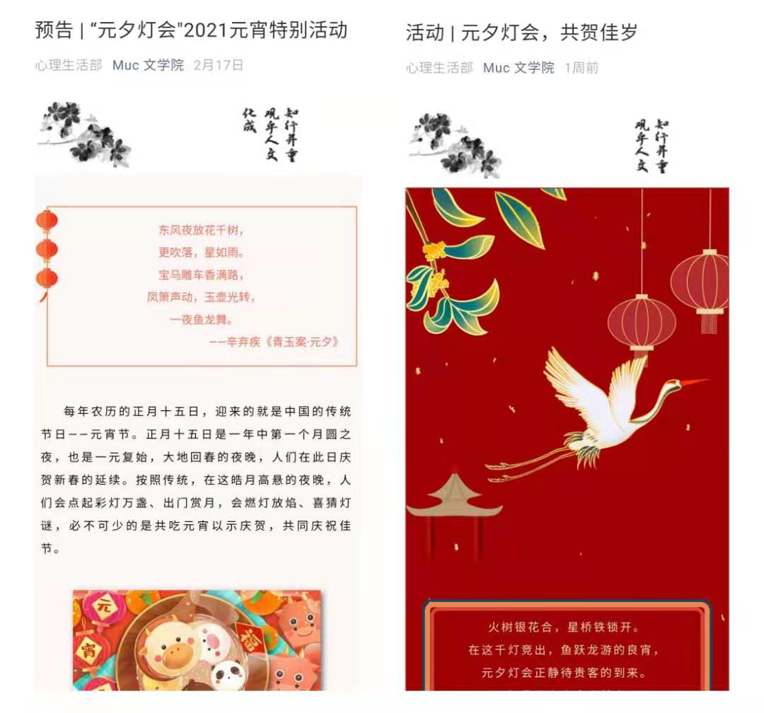 2021年2月18日,利来国际公众号发布了“元夕灯会”2021元宵特别活动的预热文章,面向全校同学征集对联、灯谜题目,为即将到来的活动奏响了序曲。