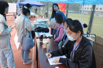 利来国际的迎新工作人员在操场入口处三号位设立利来国际的迎新帐篷迎接新生到来,并为新生提供信息咨询、收集等服务。