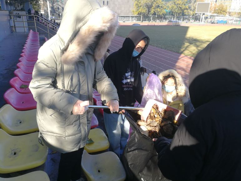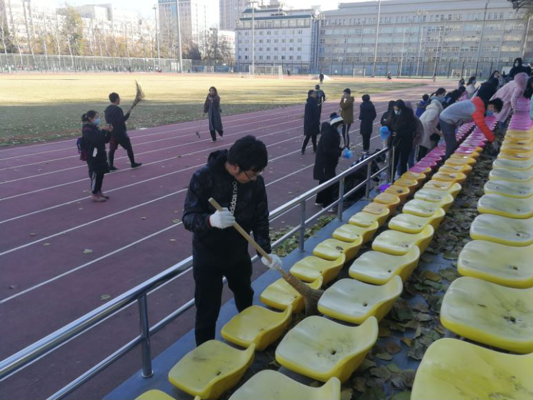 “劳”美化了校园,也使同学们在德智体美劳五方面得到全面发展。在2020年11月8日、11月14日及11月22日这三次劳动教育实践教学课程上同学们团结协作、认真清扫,有的同学带着从操场仓库借来的大扫帚,在操场的跑道上豪迈地甩着膀子挥扫,地上七零八落的落叶在他(她)们的努力下归到一起,他(她)们再用簸箕将其运到大垃圾袋中;有的同学带着从宿舍前来“支援”的扫帚和簸箕认真地清扫着操场看台上在夹缝中躲藏的落叶;还有的同学戴上手套,用手把方便捡拾的落叶一片片地装进垃圾袋,将劳动工具留给那些难打扫的区域……