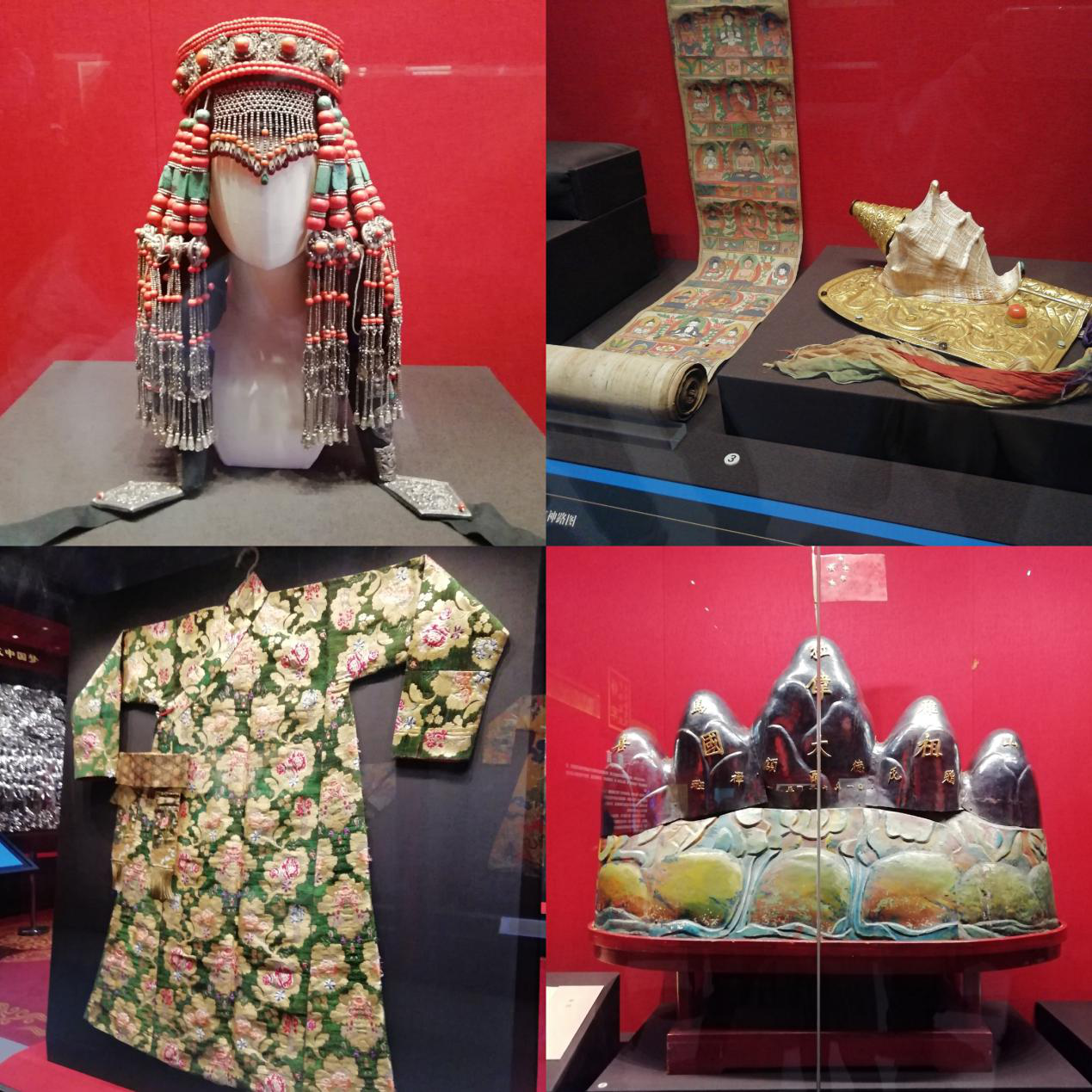 在展馆中,少数民族风格的物品随处可见。令我印象最深的是蒙古族少女的头饰和她们佩戴的匕首,仿佛看到了她们在草原上骑马射箭时的英姿飒爽;讲解员向我们讲述传说中的金瓶掣签的故事,神圣且神秘,了解了藏族藏传佛教的历史和风俗;纳西族妇女头上佩戴的帽子和身着的服饰,让我仿佛回到了那个遥远的时代。