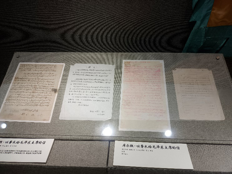 今天去民族文化宫参观了铸牢中华民族共同体意识系列展,在第一个“建国初期全国少数民族敬献给中央人民政府礼品展”中最让我印象深刻的是新疆库尔班大叔给毛主席的信。搁着玻璃窗,当年的信已经有些泛黄。讲解员告诉我们库尔班大叔做了几十年的长工,没有任何家产,日子过得一贫如洗。解放后,库尔班大叔分到了几亩田和一匹小毛驴。日子也渐渐好起来了,库尔班大叔除了辛勤劳作之外,最开心的事就是给毛主席写信。他还有一个心愿,就是骑着小毛驴上北京见毛主席。