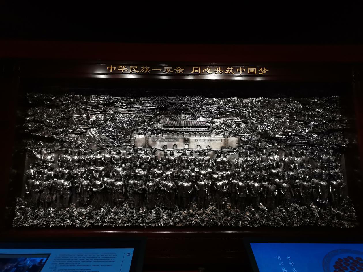 我感触最深的是在铸牢中华民族共同体意识系列展中展出的《“中华民族一家亲同心共筑中国梦”银雕屏风》。《中华民族一家亲同心共筑中国梦》大型银雕屏风由鹤庆县新华村工艺美术大师寸发标制作,其制作过程集中体现了鹤庆县白族传统银器手工制作的技艺,同时在制作过程中使用了传统银器手工艺制作从未涉及的技艺,为银器手工艺制作注入了新的活力。可以说,《中华民族一家亲同心共筑中国梦》大型银雕屏风是白族手工艺人勤劳和智慧的结晶。在讲解员的带领下,我们看到这件屏风主题鲜明,构图饱满,内容丰富,寓意深刻,以民族团结为主题,展示了各民族的精神风貌和祖国的壮美山河,是一件集中展示民间传统技艺的好作品,代表了我国当代银器制作的最高水平。栩栩如生的人物,丰富多样的服饰,银雕中的每位人物都有着饱满的热情和良好的精神面貌,各民族像石榴籽一样紧紧拥抱在一起,亲如一家,各民族团结奋斗,共同繁荣发展,一定能实现中华民族伟大复兴的中国梦!