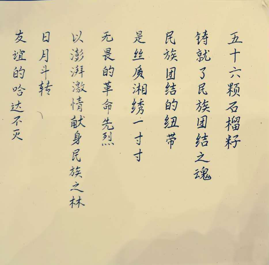 我细细地观赏每一个展品,惊叹于少数民族劳动人民的惊艳技艺,打动于他们的匠人精神。你看“孔雀羽金丝织锦长袍”,丝丝线线捻起来的是匠人的心血,刺在锦缎上传承下来的是一个惊艳的民族与时代;你看“鄂尔多斯头饰”,各种颜色和大小不一的珠子排列起来却完美无瑕,透过橱窗我看到了一种繁重的华美,沉甸甸的是这个民族的特色与文化;你看“中华民族一家亲,同心共筑中国梦”的巨型雕刻,据说匠人们雕刻了整整四年才完工,祖国的万里好山河就在五十六个民族的身后,共同谱写着民族大团结的绚丽篇章。