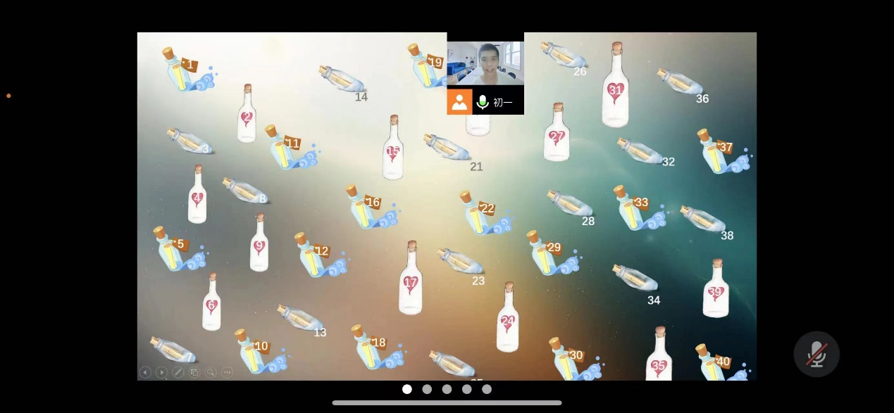 本次班会前,班长征集了每一位同学手写的一句祝福语,如感悟,随想,诗歌等,将其整理编号。交流会中同学们会在抓阄小程序抽到一个属于自己的号码,并能够得到与这个号码对应的祝福语。因为过程具有随机性,因此整个过程犹如漂流瓶。会议上因时间原因,只展示了有限的漂流瓶。漂流瓶里是同学们的愿望与企盼,漂流瓶里亦是同学们的祝福与希冀。同学们的一张张寄语充满着对未来的希望和畅想,带着真诚和祝福一起走向充满着星辰大海的远方。