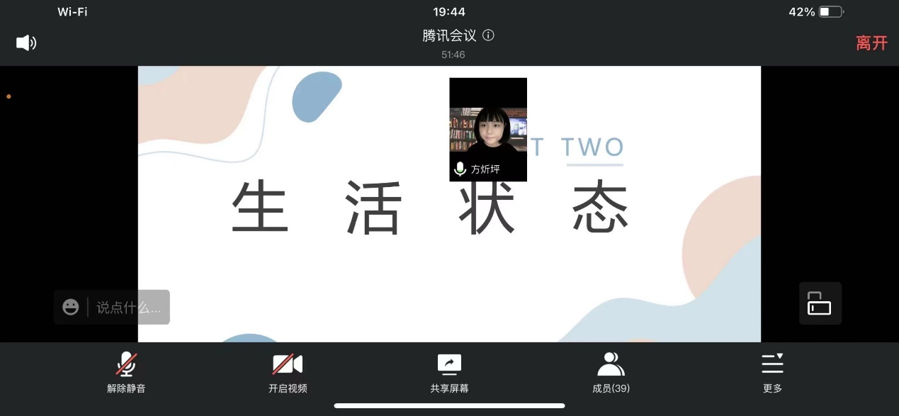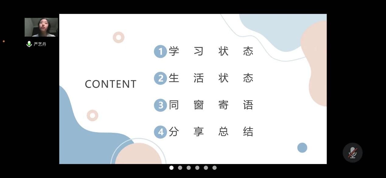 本次班会设置了四个分享的话题,分别为学习状态,学习方法,生活点滴与书籍,音乐,电影的推荐。同学们纷纷就自己的经历与体会畅所欲言。王雪纯、王阳阳、杨云昊,沈希雅、董鑫妮、马建英、薛雯文、方炘坪、何鑫、李子骏、古丽牙尔、包安妮、梁佳惠、吕阳等14位同学就各自话题谈论了自己的看法。同学之间的分享交流更引起了相互之间的共鸣,有相似经历的同学们也在腾讯会议的对话框里分享自己的经历。