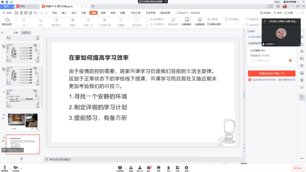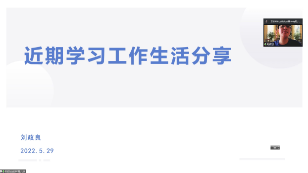刘政良同学围绕着“学习、工作、生活”这三大主题,结合近期的亲身经历进行了分享。在学习方面,要按时上课、做好笔记、认真及时完成作业;科学制定期末复习计划、以平常心沉着应对考试。在工作方面,要继续保持工作热情和严谨的态度,细致地处理好被交付的各项工作;同时要处理好工作与学习之间的关系,寻找到二者理想的平衡点。在生活方面,多“出去走走”,感受世间的美好,让自己放松身心、保持良好的心理状态;居家期间一定要进行居家运动,既能强身健体,放松心情,又可以提高生活质量;在空闲时间利用国家提供的多种教育平台学习、拓展一些技能,提升自己的综合能力。