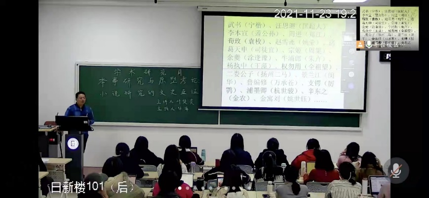 讲座回顾了古典小说的本事、原型研究的学术史与丰硕成果和特殊的文化意义。通过展示《儒林外史》的原型人物特色,为同学们揭示了做原型考辨研究的三条路径。其一是考察并立足于作者的交游圈,逐一阅读潜在原型人物的诗文集;其二是对比原型人物与书中人物的姓名字号,例如小说中的诸葛天申(名佑)与原型人物司徒宜(字左文)的姓名相呼应且同出《礼记·中庸》;其三是对比原型人物的行迹与小说人物的经历,如原型人物汪思迴对自身宏富著述的自得心态就是小说中匡超人相关描写的来源。谈及研究经历,叶老师概括道:原型研究是一个双向发现的过程:新材料的发现可以推动原型人物的考证,而原型人物的确定也使得更多材料被纳入研究视野。